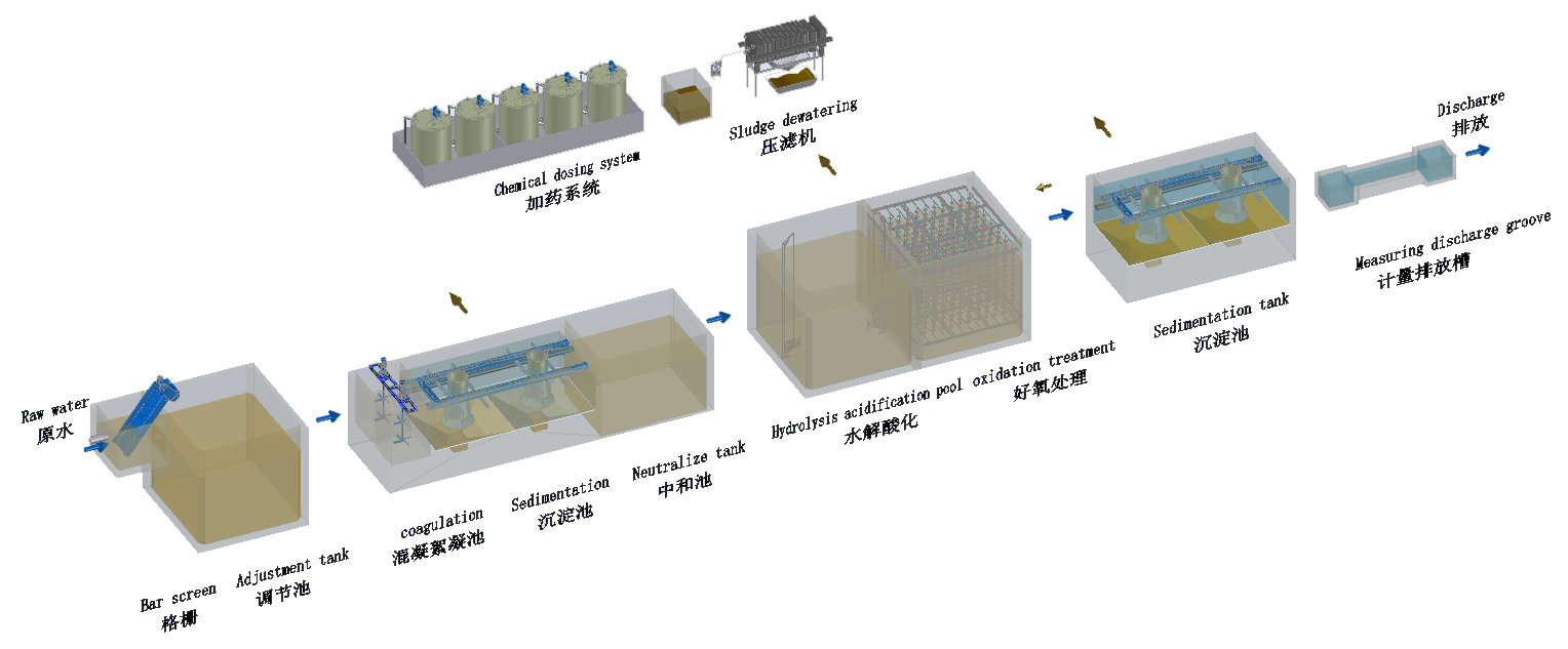 廢水從車間排放先經(jīng)過格柵去除大顆粒懸浮物質(zhì)后進(jìn)入調(diào)節(jié)池,調(diào)節(jié)水質(zhì)水量,然后由提升泵打入混凝池,通過投加藥劑進(jìn)行混凝反應(yīng),然后進(jìn)入絮凝池,投加絮凝劑進(jìn)行絮凝反應(yīng),后進(jìn)入斜板沉淀池進(jìn)行固液分離,上清液進(jìn)入中間水池,然后進(jìn)入水解酸化和好氧生物處理,后進(jìn)入二沉池進(jìn)行固液分離,上清液進(jìn)入排放水池,然后經(jīng)計量排放槽計量排放。